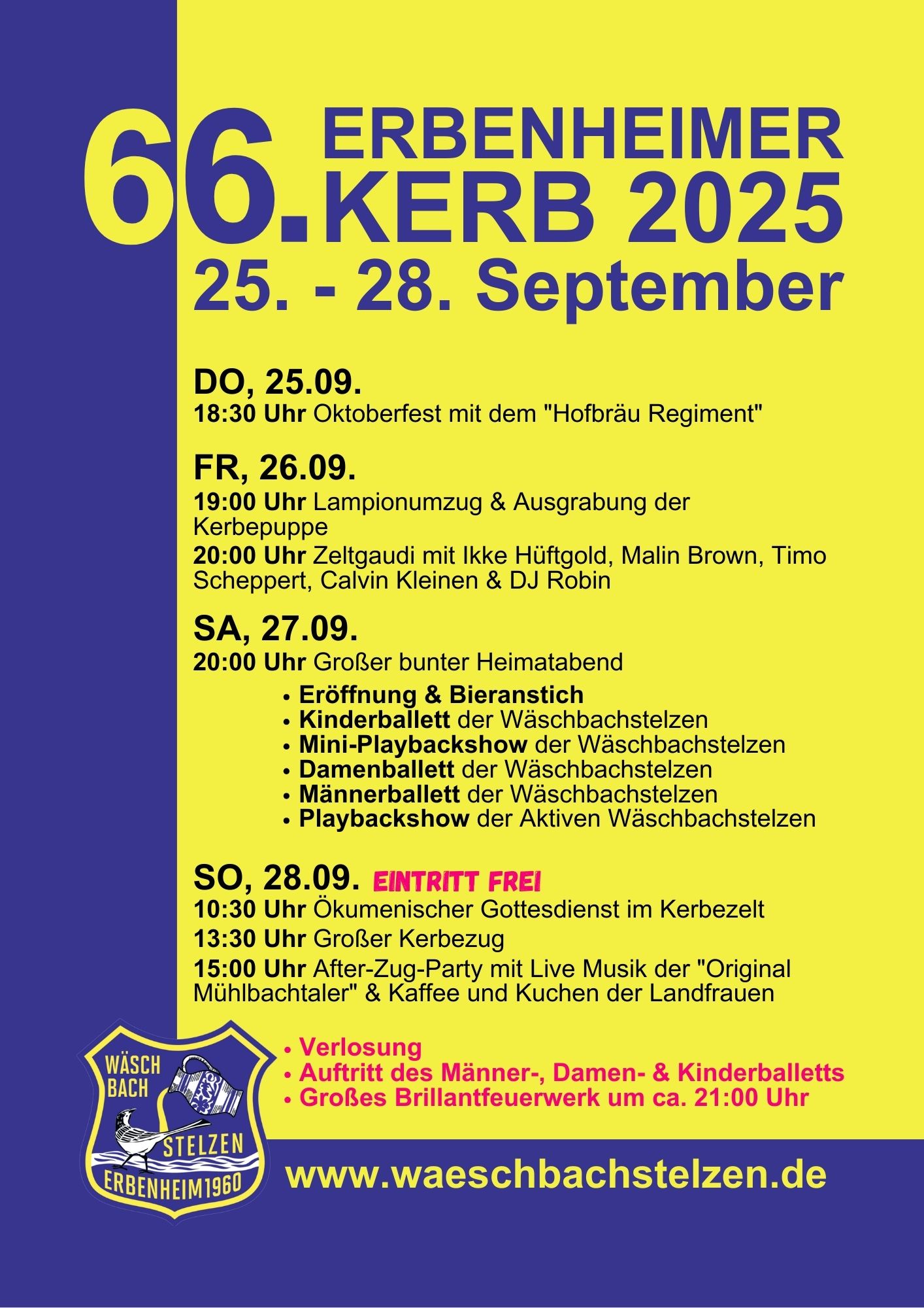 Wir laden euch ein zu unserer 66. Erbenheimer Kerb vom 25.-28.09.2025 auf den Festplatz am Bürgerhaus in Erbenheim!