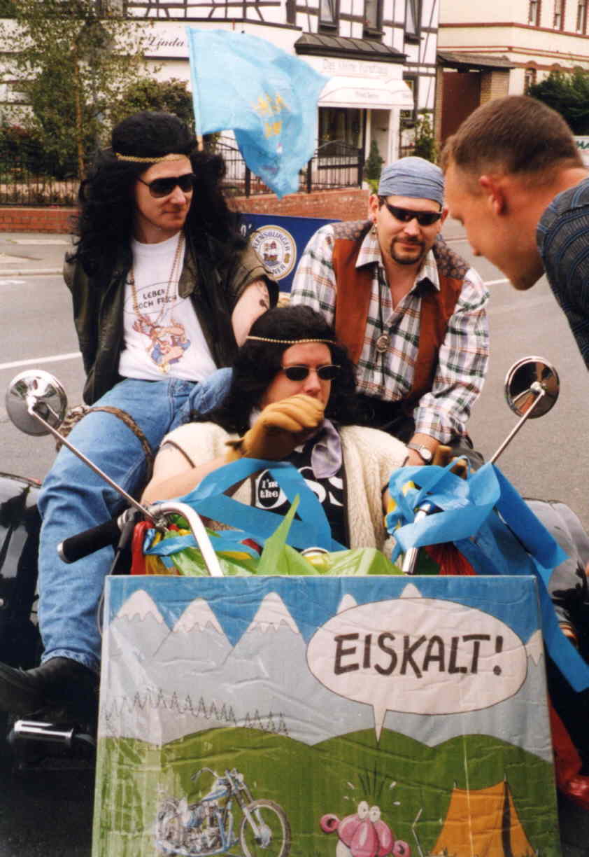 ...hatte man den ersten öffentlichen Auftritt beim Masken- und Kostümball der Wäschbachstelzen. Der gemeinsame Aufmarsch mit 9 Nikoläusen war gelungen. Im gleichen Jahr war man mit dem 6er Fahrrad-Tandem und einem „Versorgungsfahrzeug“ im Kerbezug dabei.